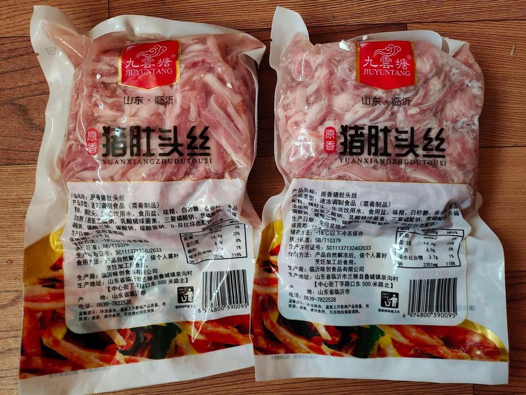 两袋半熟肚丝收到了,是正品,满满两斤,泡沫箱发送,说明详细,冷冻储藏。煲汤,爆炒,凉拌都可以。春节前收到了,比较满意!