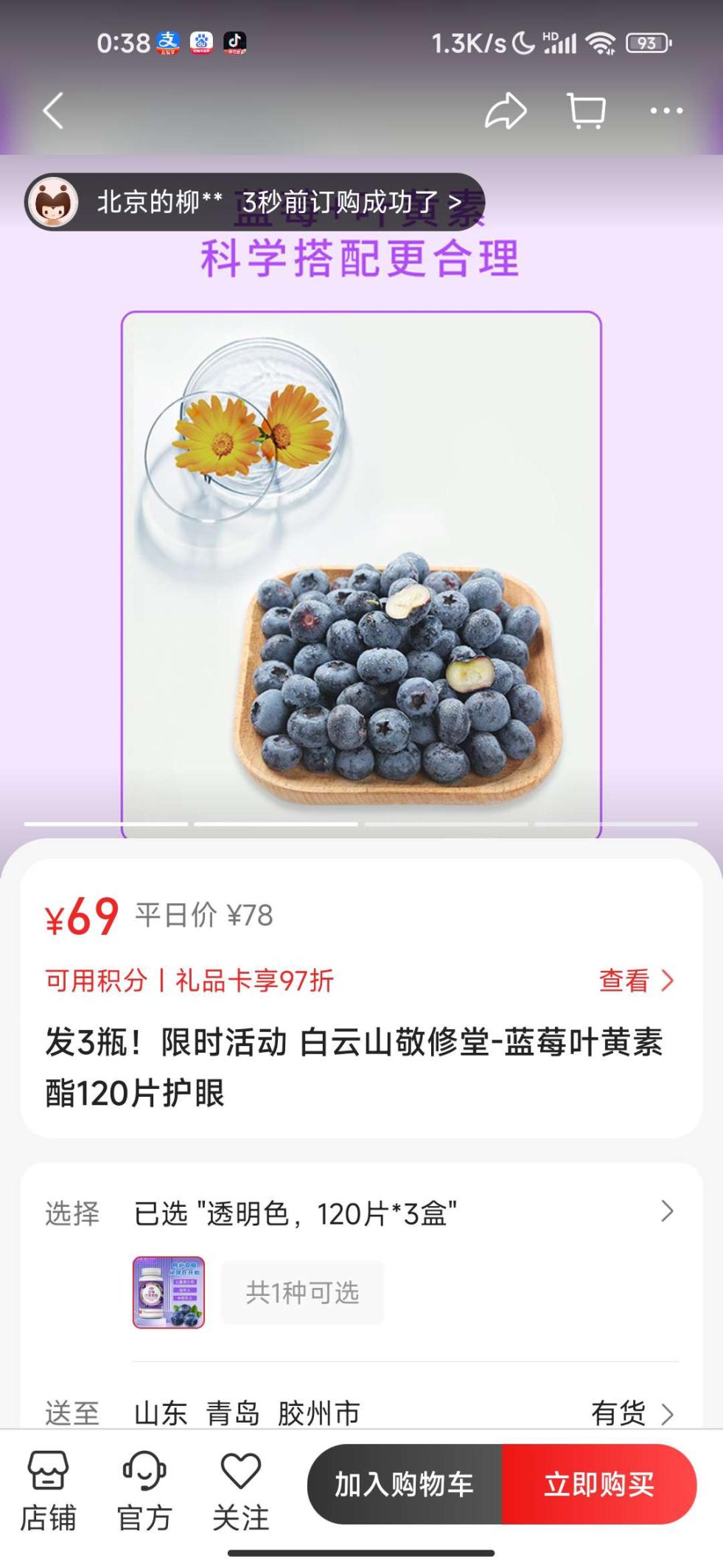 白云山敬修堂蓝苺叶黄素多次购买,效果真的好!