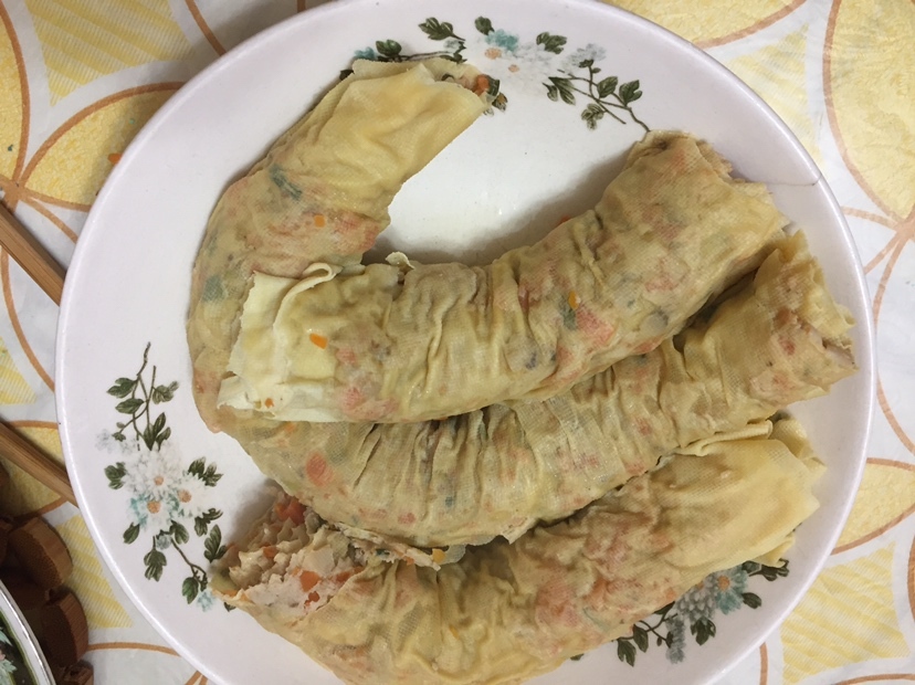 肉末、胡萝卜🥕、香菇加各种调味料做成馅,铺满整张百页皮,再卷起来做成百页卷,放蒸锅中蒸熟即可。