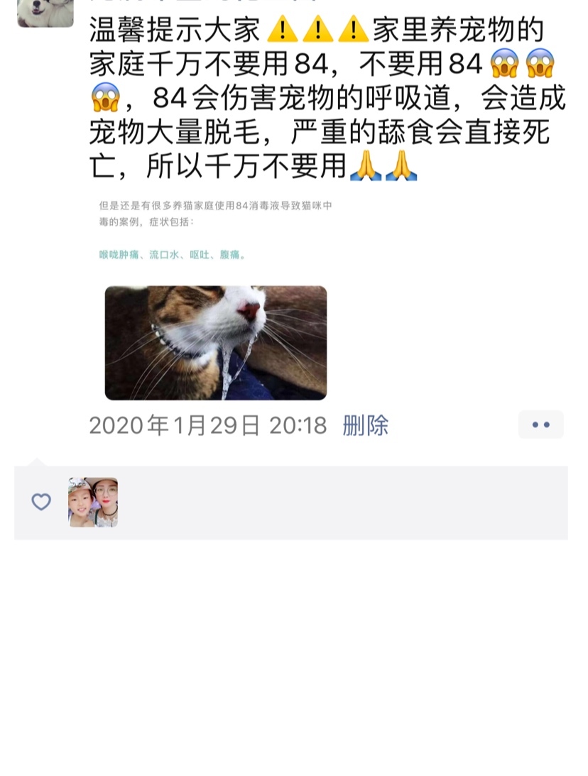 温馨提示大家⚠️⚠️⚠️家里养宠物的家庭千万不要用84,不要用84😱😱😱,84会伤害宠物的呼吸道,会造成宠物大量脱毛,严重的舔食会直接死亡,所以千万不要用🙏🙏