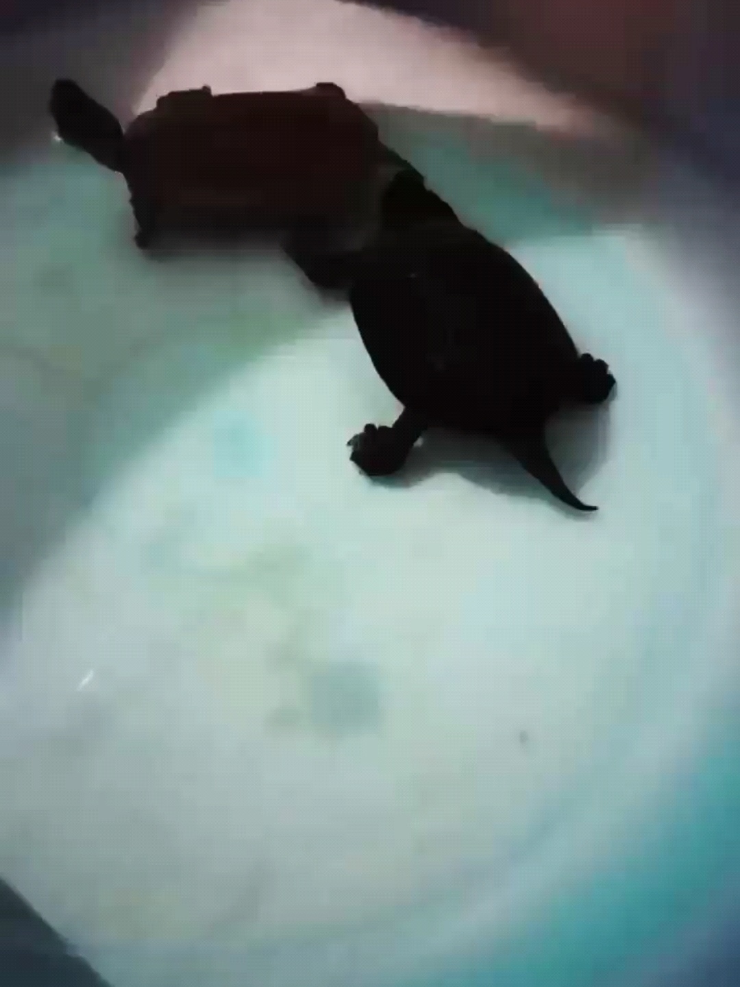 两只在嬉戏的乌龟。一只老黑龟29岁,一只去年刚进家门儿的小金钱龟。