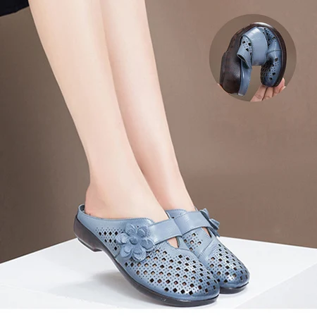谜存 头层牛皮防滑轻便舒适拖鞋· 魔术贴调节自由 花朵镂空超透气 ·兰色