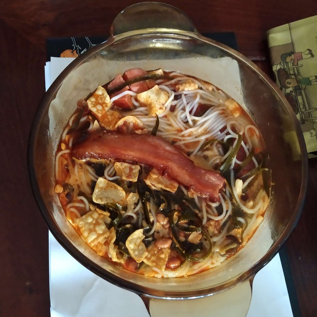 康宁锅康宁电陶炉煮成的螺丝粉配自制的五花叉烧。