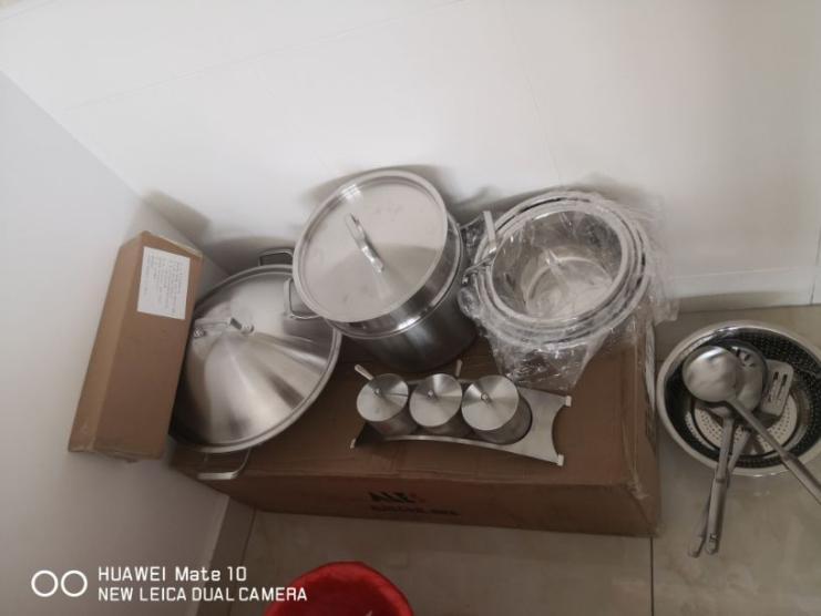 从准备要买到收到货不到24小时。 大大小小,零零碎碎总共28件 统统是不锈钢;就锅底稍微有含点铁(这应该是工艺需要吧,必须它满足燃气炉气化灶电磁炉等)。 这么说,这是这么多年电视购物当中最划算的一次。