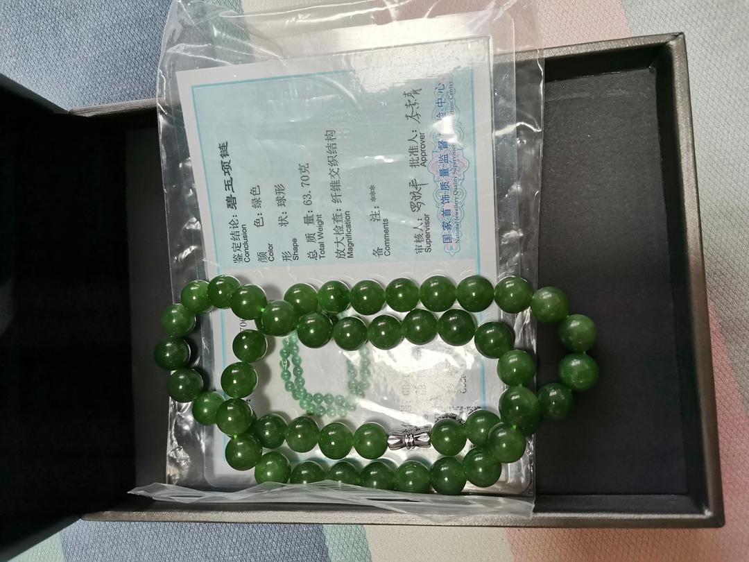 串珠项链已经收到,无黑点七号坑碧玉,颜色辣绿。串珠项链光泽靓丽,非常喜欢,值得收藏、传承。