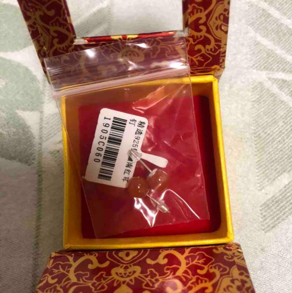 非常小的一对南红耳钉,针是银的,拖是硅胶的,颜色偏粉红,价签上标着399元,戴上感觉很秀气。