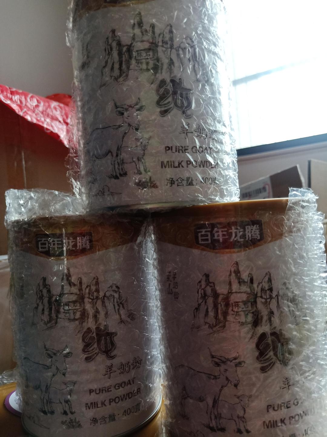 百年龙腾全脂纯羊奶粉,一组5瓶,每瓶还有气泡胶包好,包装非常好,据父母反馈,吃着都很好,每天早晚都喝。