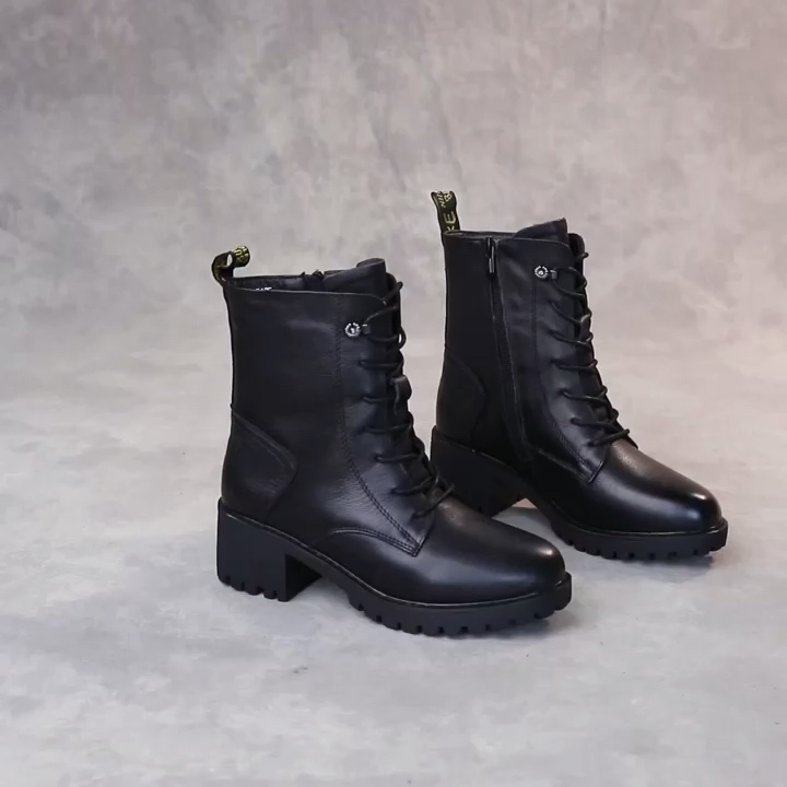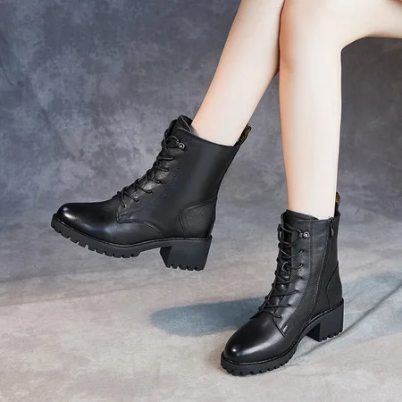 ANYMANNER新款真皮粗跟厚底英伦风加绒中筒马丁靴·62695-黑色