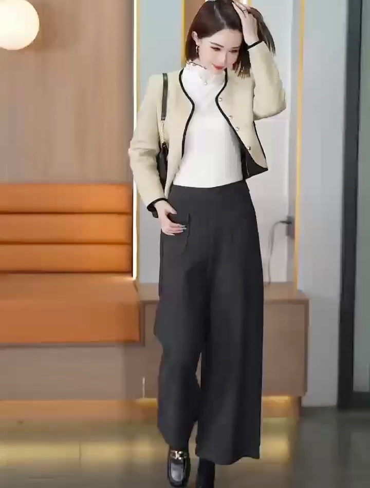 【大牌代工厂出品】和顺圣加厚羊毛呢后松紧腰阔腿裤3072·燕麦色