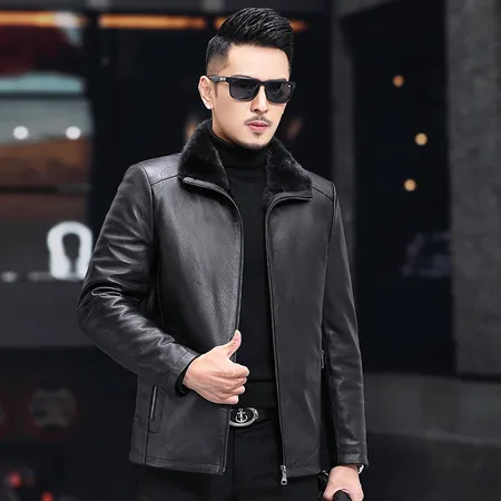 安柘娜 A556黑色头层牛皮水貂毛内里男式皮草夹克B·黑色