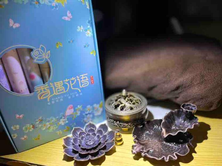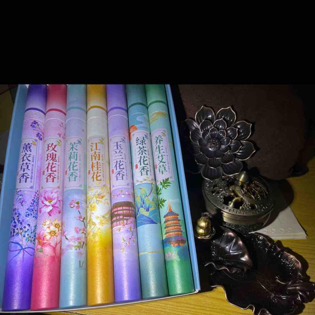一套七桶,盒盖一开,花香袭人。七种花香,七种享受。直播间蹲守的福利,等的很值得。多次购买后,这次终于凑齐了点香三宝。喜鹊登枝香炉、荷叶倒流香盘、莲花香盘。感觉人生圆满了。哦 ,还有一个小葫芦嘴香插。一家子齐全了。