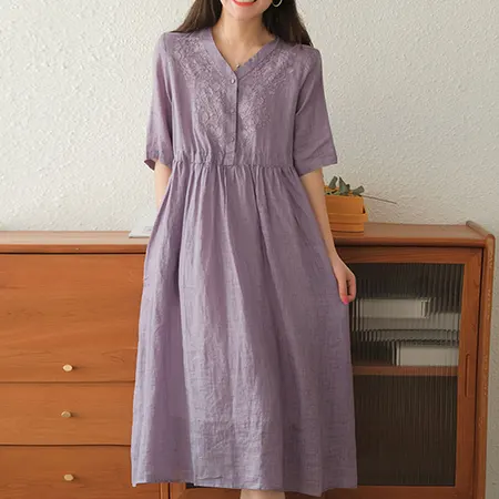 絮笈V领文艺宽松收腰刺绣棉麻连衣裙·紫色