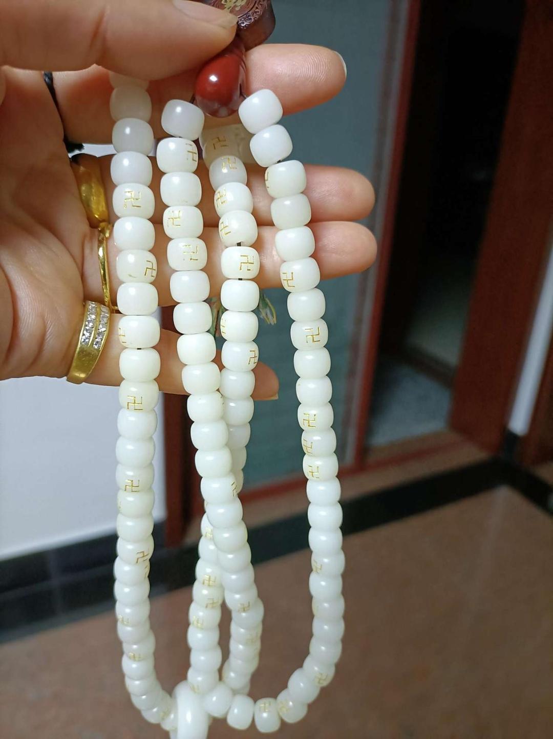 六梵,飞老板家直播,请的白玉菩提手串收到了,戴了很好漂亮的,雕刻的万字纹很好,我个人不喜欢白颜色,所以送人,谢谢飞老板推荐的好东西,谢谢商家服务,五星好评!