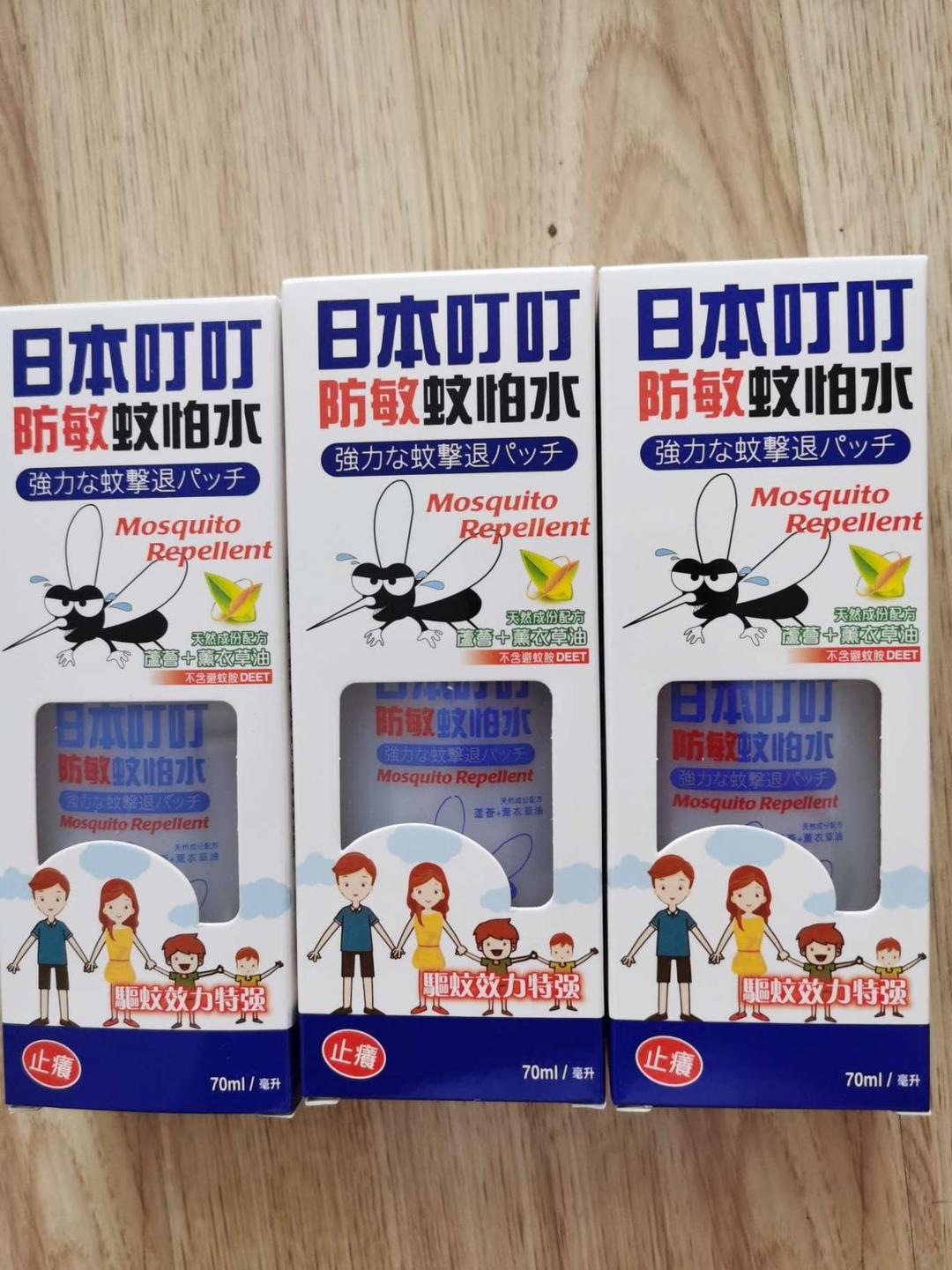 曰本叮叮驱蚊啧雾70ml三瓶驱蚊水很好管用,轻轻喷雾到身体上蚊子不敢靠近,一个字好!!!