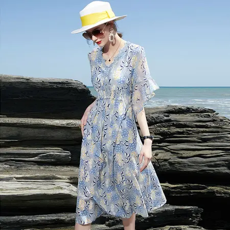 今升V领蕾丝荷叶边印花真丝连衣裙·灰蓝色