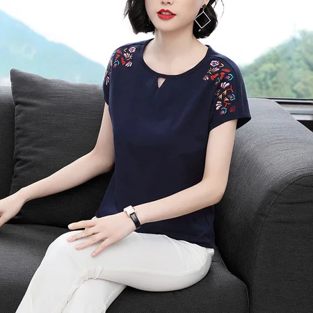 雀说刺绣t恤女短袖中国风宽松大码半袖民族风上衣打底衫TAL9609·藏青色