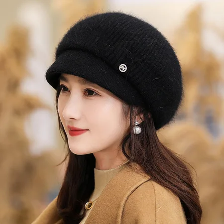 絮笈简约百搭兔毛女针织保暖鸭舌贝雷妈妈帽·竖条黑
