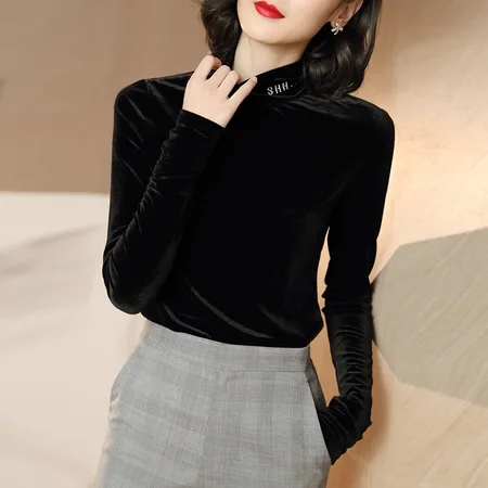 玉露浓 清仓款金丝绒半高领长袖显瘦打底衫·黑色