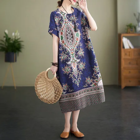 絮笈民族风复古印花棉麻短袖连衣裙·蓝色
