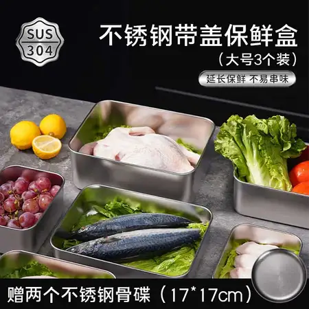 【赠2个骨碟】方形大号304不锈钢带盖保鲜盒3个·默认