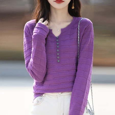 【100棉/软糯】小V领简约百搭早秋长袖上衣YLN77·紫色