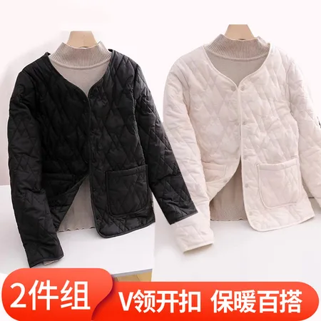【2件组/反季清仓】时尚花纹V领开扣口袋羽绒棉内胆外套·黑色+白色