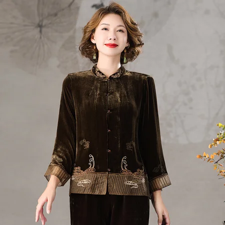 【真丝绒/刺绣】立领九分袖国风大气开衫外套·深咖色