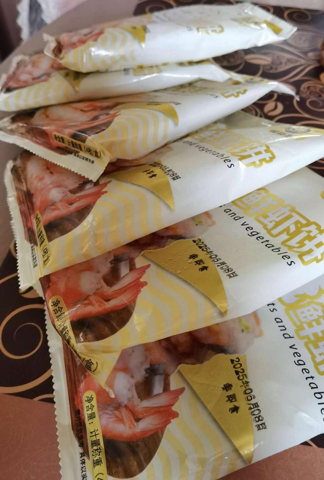 虾饼好吃,煎一下很方便,一共六袋每袋四个,全家都喜欢,冷链发货物流很快。