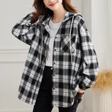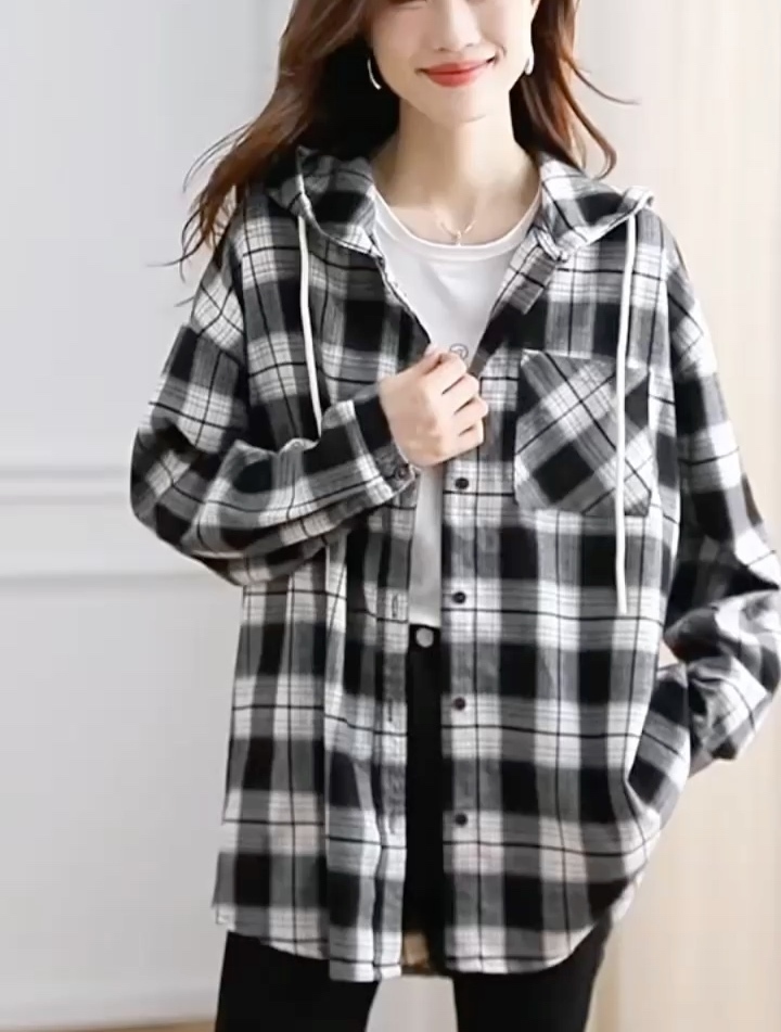 可风各宽版连帽格子长袖衬衫48163·黑格