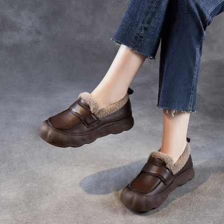 专注轻奢真皮女鞋设计生产,柔软头层牛皮,内里鞋口都是加厚羊羔毛严实包裹,非常暖和。