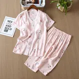 谜存 夏季带胸垫凉爽绵绸印花家居套装(短袖七分裤)·粉色