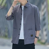 红览 纯棉七分袖衬衫男士港风休闲工装纯色衬衣外套Q622 H·灰色